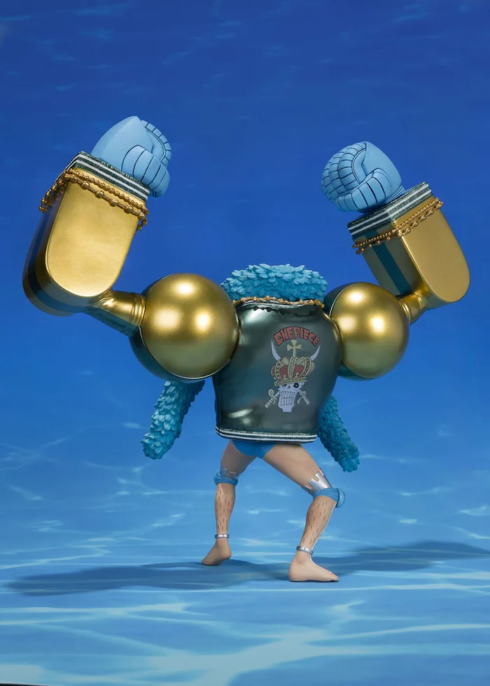 Celebrate the 20th anniversary of the legendary series One Piece with “Iron Man” Franky from Bandai’s Figuarts Zero series! Standing 10,4” tall, the cyborg shipwright of the Straw Hat Pirates took bling-bling one step further than the rest of the crew by covering his enormous arms in gold. Just like his fellow crewmates, he’s wearing all gold and blue while staying faithful to his peculiar open shirt with briefs style.