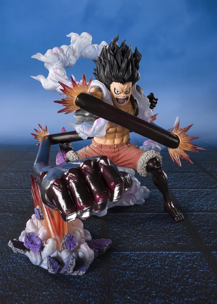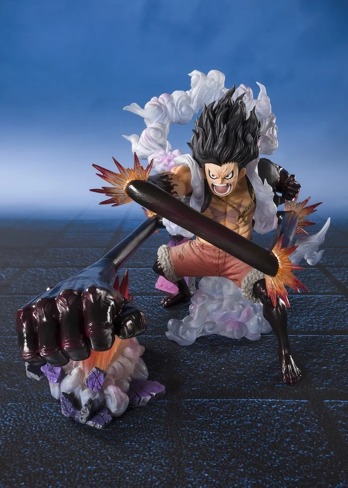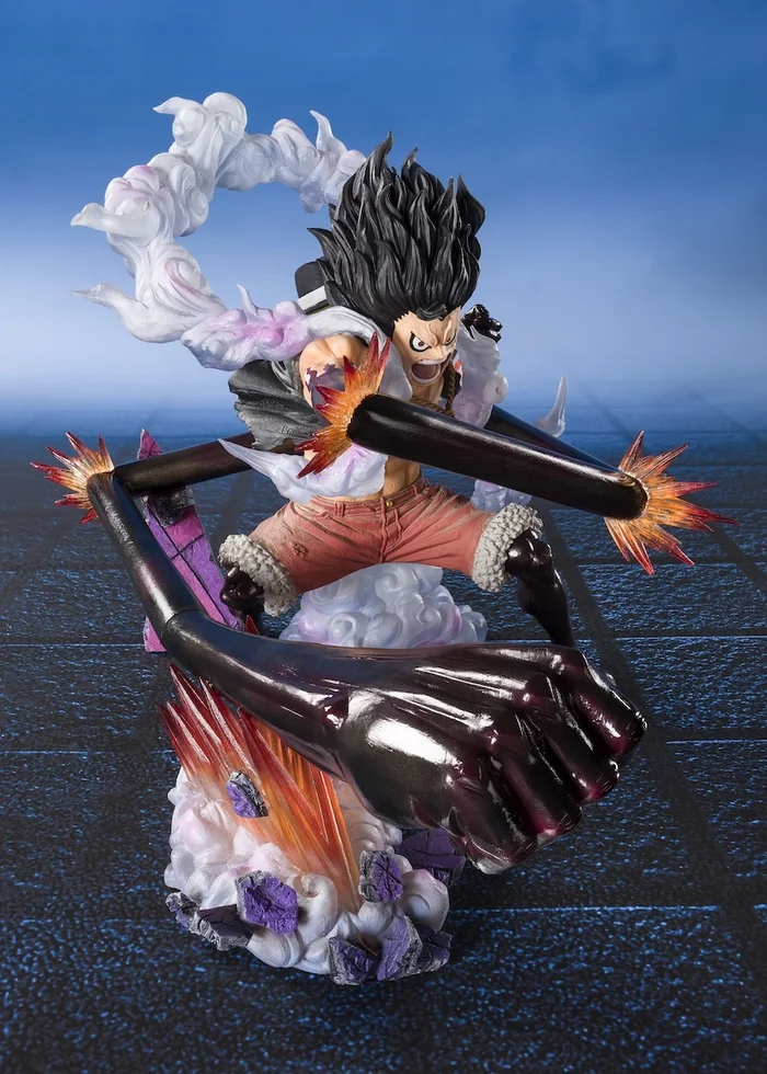 From the Chogekisen: Extra Battle series comes Monkey D. Luffy in Gear Fourth form! Translucent parts are used to heighten the impact of this dynamic fixed-pose figure. It was carefully sculpted and engineered to capture all of the on screen action in an incredible, immersive display. The climax of Luffy’s long battle with Katakuri takes form on your tabletop! The set includes a stand.