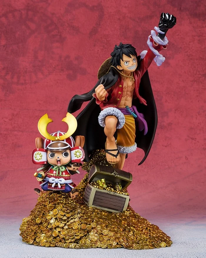 Voted No. 1 in the WT100 poll, our pirate boi is captured at a height 7.5″ looking triumphant with one foot resting atop a treasure chest as he pumps his black Busoshoku Haki-hardened fist to the sky. A figure of Chopper dressed in his samurai gear from the Wano Country arc is also included to display beside him. He stands on a base themed after a pile of gold and treasure and can be displayed together with