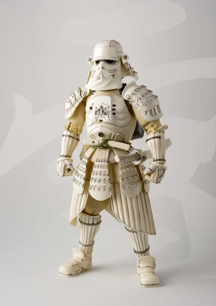 Japanโs top sculptor Takayuki Takeya creates yet another stellar take on the iconic Star Wars universe for the Meisho Movie Realization figure series. Standing 6.7โ tall, the figurine depicts an eye-catching Meisho-era version of the Snowtroopers that first appears in The Force Awakens with their cold region armor perfectly recreated in an anachronistic design sure to stand out in any fanโs collection. The figure comes complete with a pair of optional hands, a samurai sword, and a newly molded tripod blaster.