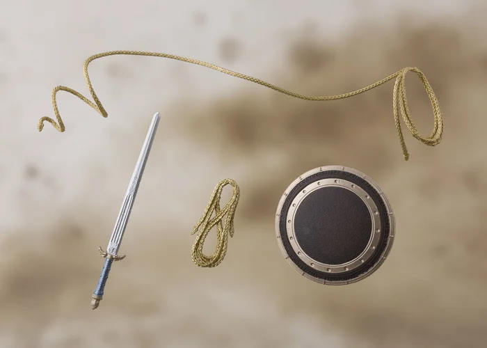 Utilizing digital coloring to perfectly capture Wonder Woman as portrayed by Gal Gadot, the figure includes an optional pair of hands, an optional head, and a set of weapons (sword, shield, and whip).