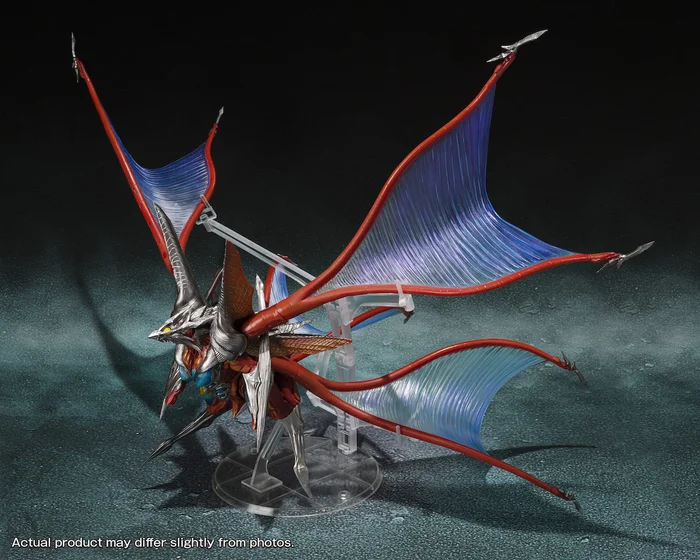 Iris, the antagonist from the classic kaiju film Gamera 3: The Revenge of Iris, joins S.H.MonsterArts! Includes translucent option parts for replicating scenes of it soaring over the skies of Kyoto! Fuyuki Shinada, who created the suit used in the film, oversaw the sculpting of the figure for superb accuracy. The coloring utilizes the same system of paint over translucent parts to achieve accuracy for the chest and head. Some parts even use pearlescent paint for faithful realism. And accessories are included that let you replicate it with tentacle razors dramatically expanded in flight mode. A stand lets you display it in various poses with ease.