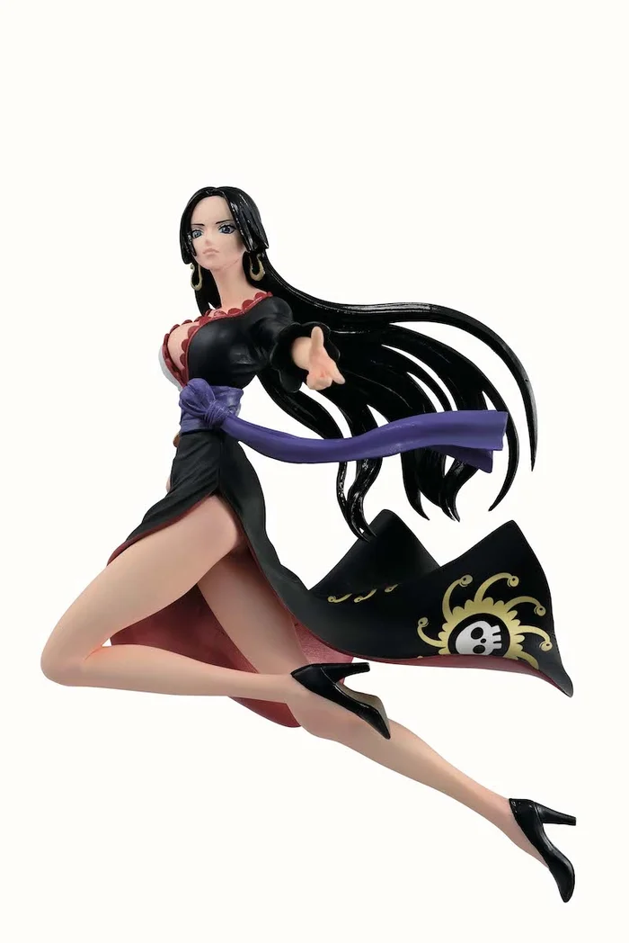 From Bandai’s Ichiban Figure line comes “Snake Princess” Boa Hancock from One Piece showing off her unmistakable allure. Measuring 7” tall, she leaps into the air in a revealing side slit red dress that shows off her long legs and is tied at the waist with a long obi that flows in the breeze behind her along with her jet black hair. With her hand outstretched, she flashes a confident yet cool glance your way. Add her to your collection!